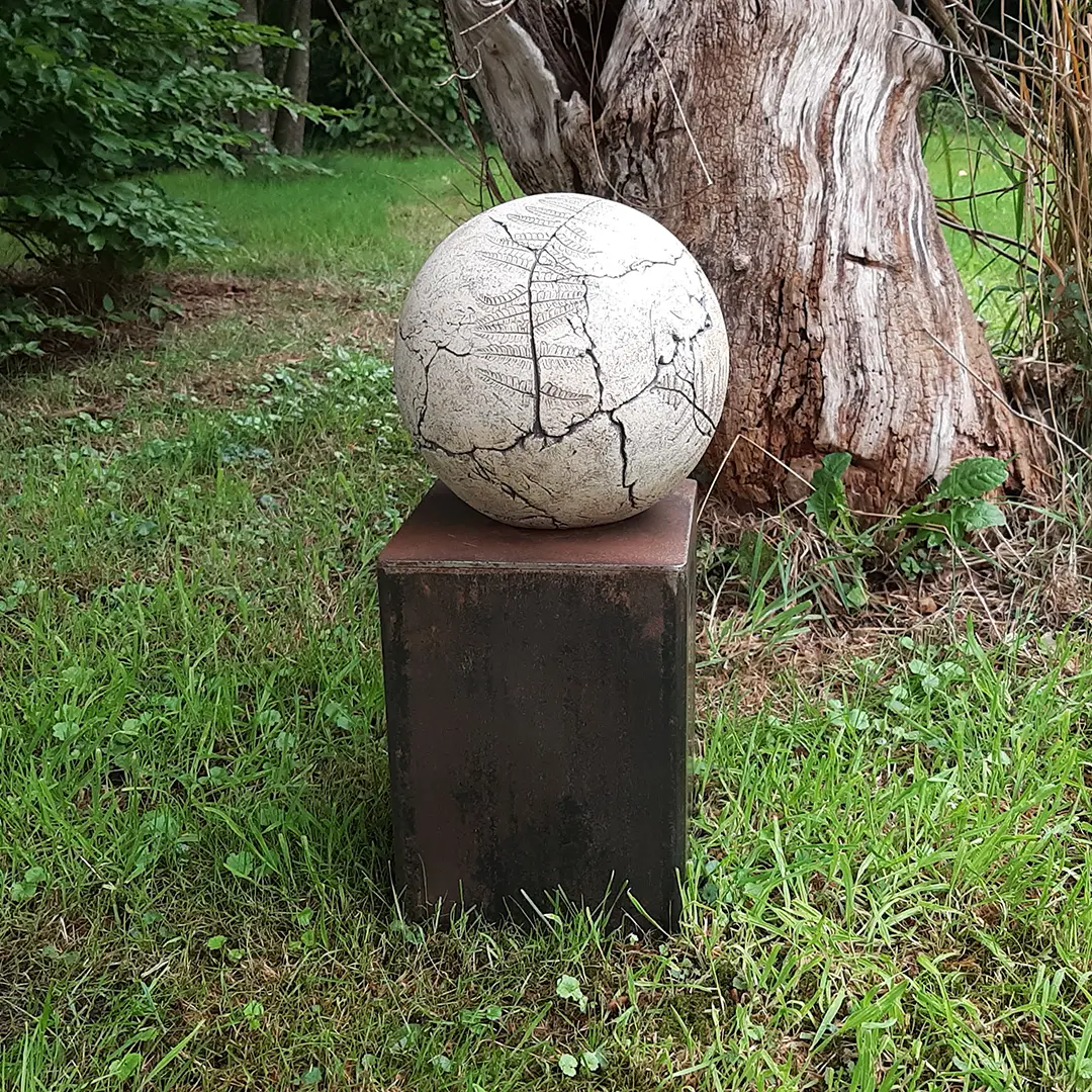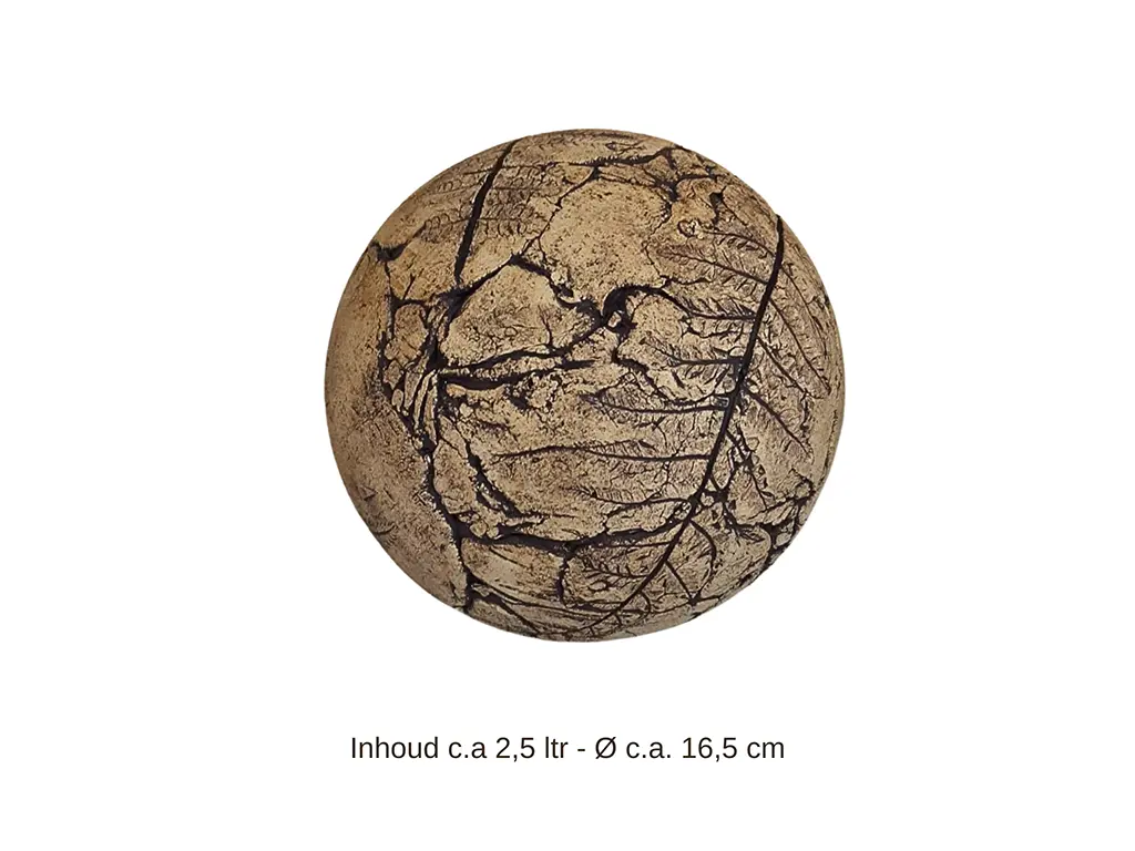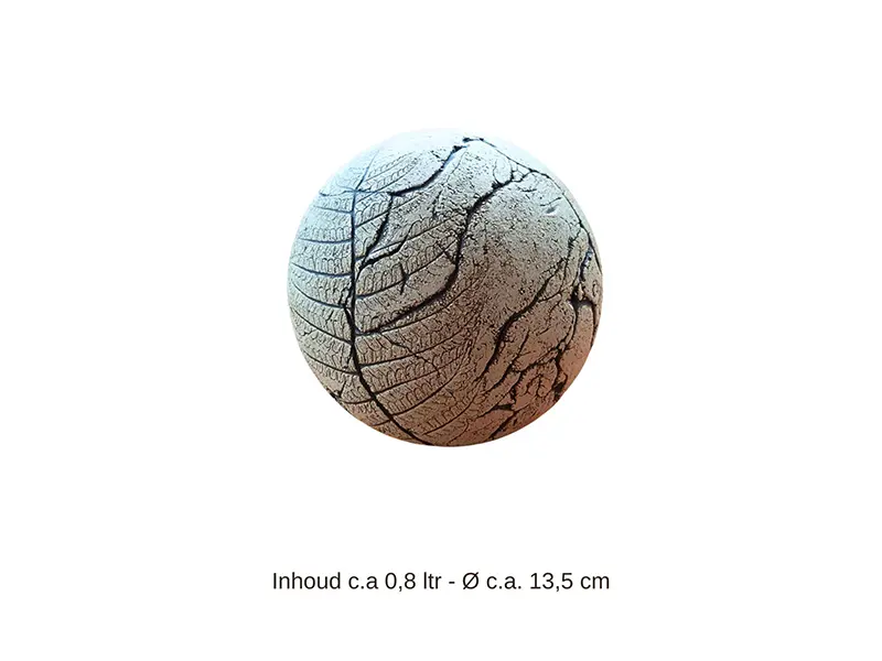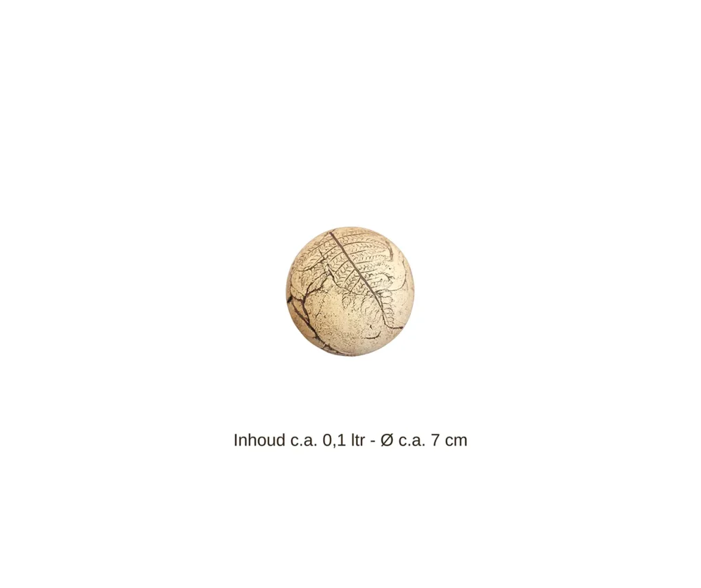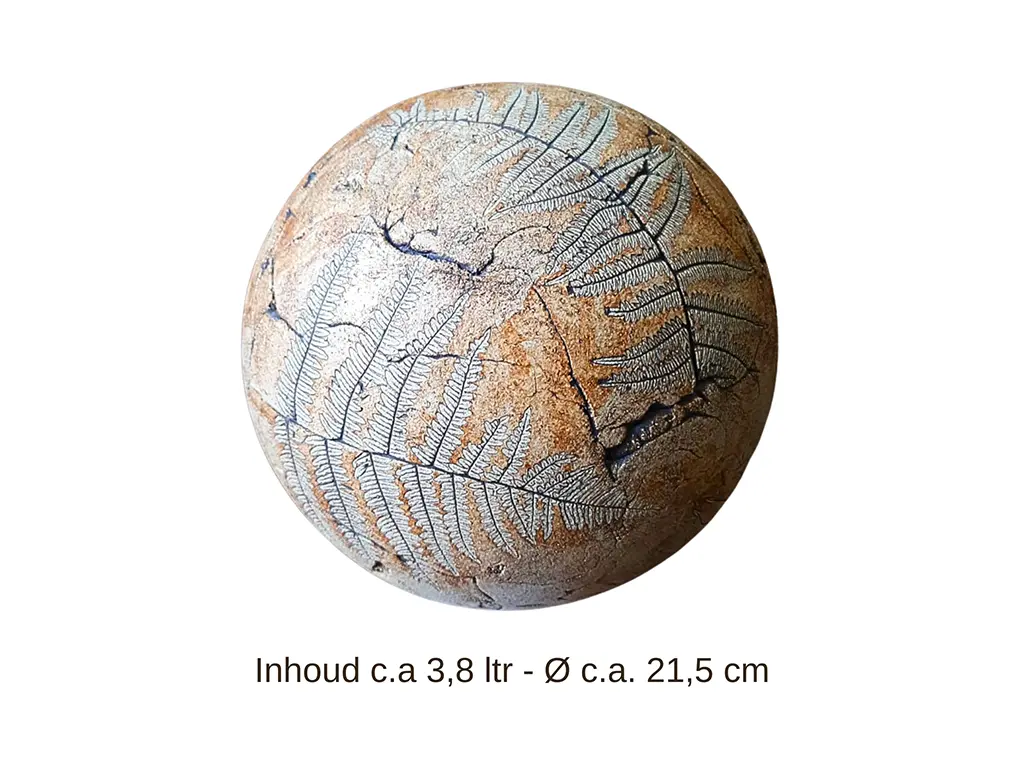 Deze handgemaakte keramieken bol-urn is bijzonder en uniek, omdat elk object met de hand wordt gemaakt en behandeld met natuurlijke oxides. De urn toont een mix van lichte en donkere bruintinten in de afwerking, waarin echte bladeren uit de natuur zijn verwerkt. Door deze techniek komt het gedetailleerde patroon van het varenblad prachtig naar voren. Omdat elk object anders is, kunnen de kleuren en patronen variëren, wat de ambachtelijkheid en het unieke karakter van het product versterkt. De urn biedt een mooie en rustige plek voor de as van uw geliefde. Daarnaast is het mogelijk om de urn aan te passen aan uw persoonlijke voorkeur. Voor meer informatie of een op maat gemaakte urn kunt u de pagina Naar Wens bekijken of het contactformulier invullen bij Contact.