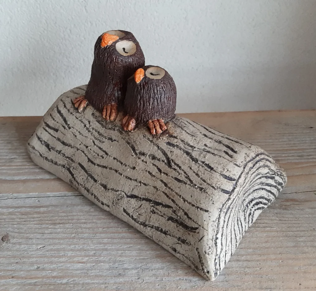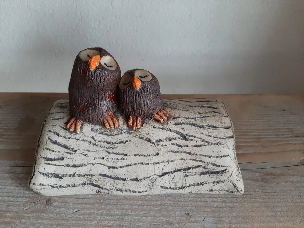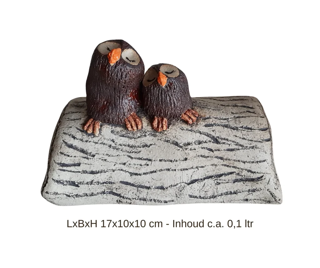 Deze keramieken urn met twee schattige uilen op een boomstam wordt geheel met de hand gemaakt en met zorg en aandacht gekleurd. De knuffelachtige uitstraling biedt troost en heeft een vriendelijke uitstraling. Uilen staan onder andere voor bescherming. Dit item is zo ontworpen dat het niet gelijk als een traditionele urn wordt herkend. Dit kan een aantrekkelijke optie voor u zijn als u een persoonlijker aandenken zoekt. Ik kan bijvoorbeeld ook iets anders maken in plaats van uilen (of zelfs meerdere uilen). Dit kan in overleg met u worden gedaan. Voor meer informatie of een op maat gemaakte urn kunt u de pagina Naar Wens bezoeken of het contactformulier invullen onder Contact.